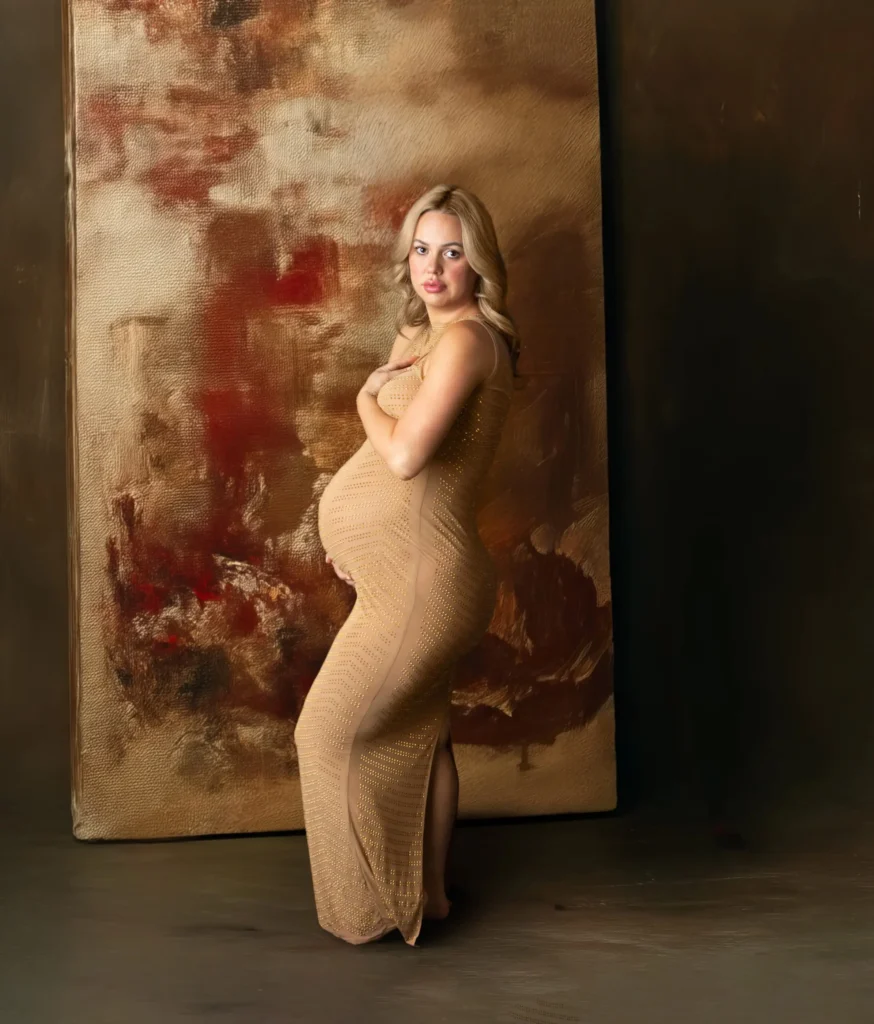 I’ve got a whole collection of beautiful maternity gowns if you want that flowy, goddess vibe (and yes, they’re all freshly cleaned between sessions). Or bring whatever makes you feel amazing – your favorite dress, something sentimental, even that perfectly fitted t-shirt that shows off your bump just right.
